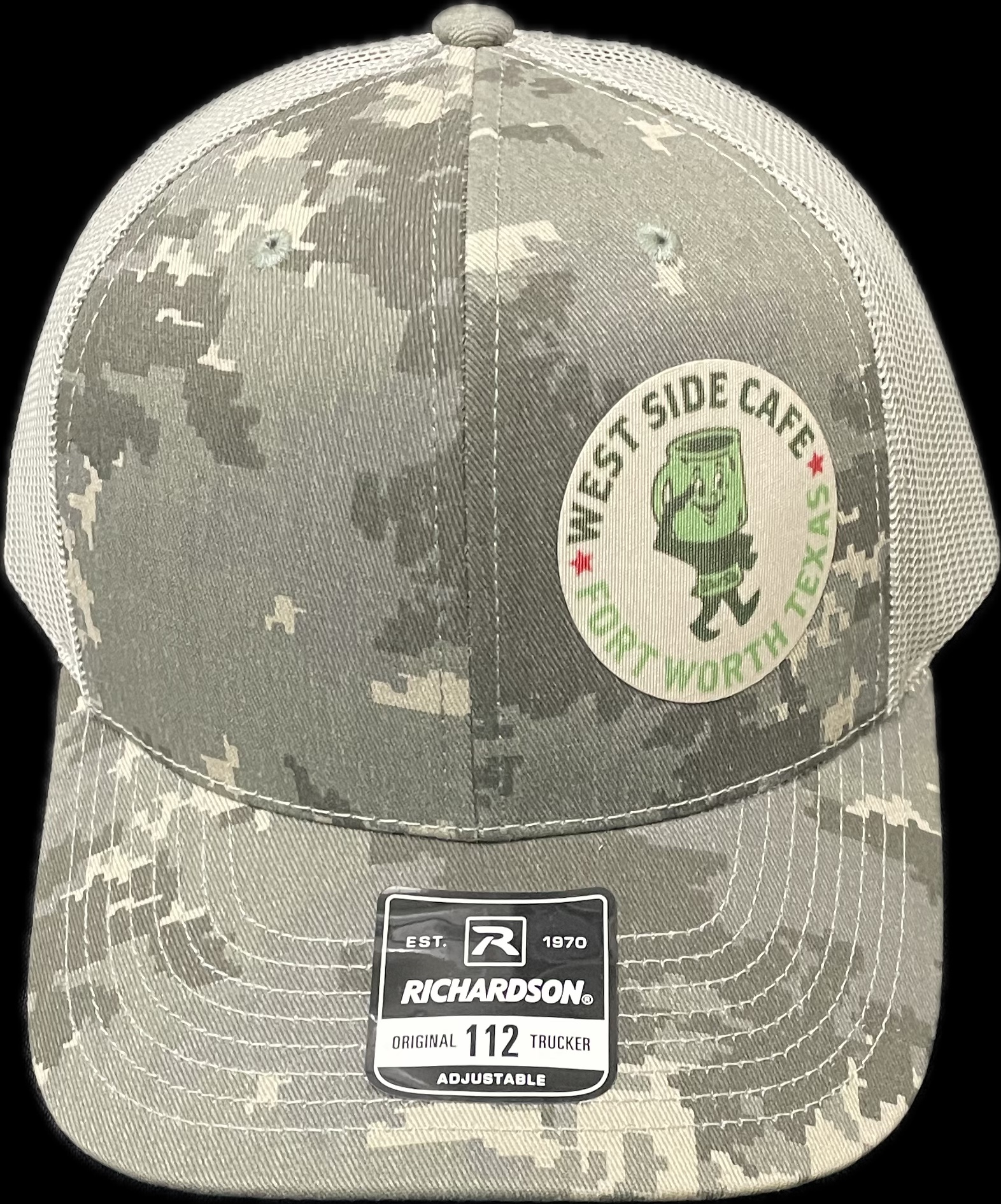 Show your Fort Worth pride with our West Side Cafe Camo Trucker Hat. With durable quality, breathable mesh, and our signature café logo, it’s a rugged and comfortable way to rep your favorite hometown spot that proudly supports veterans!